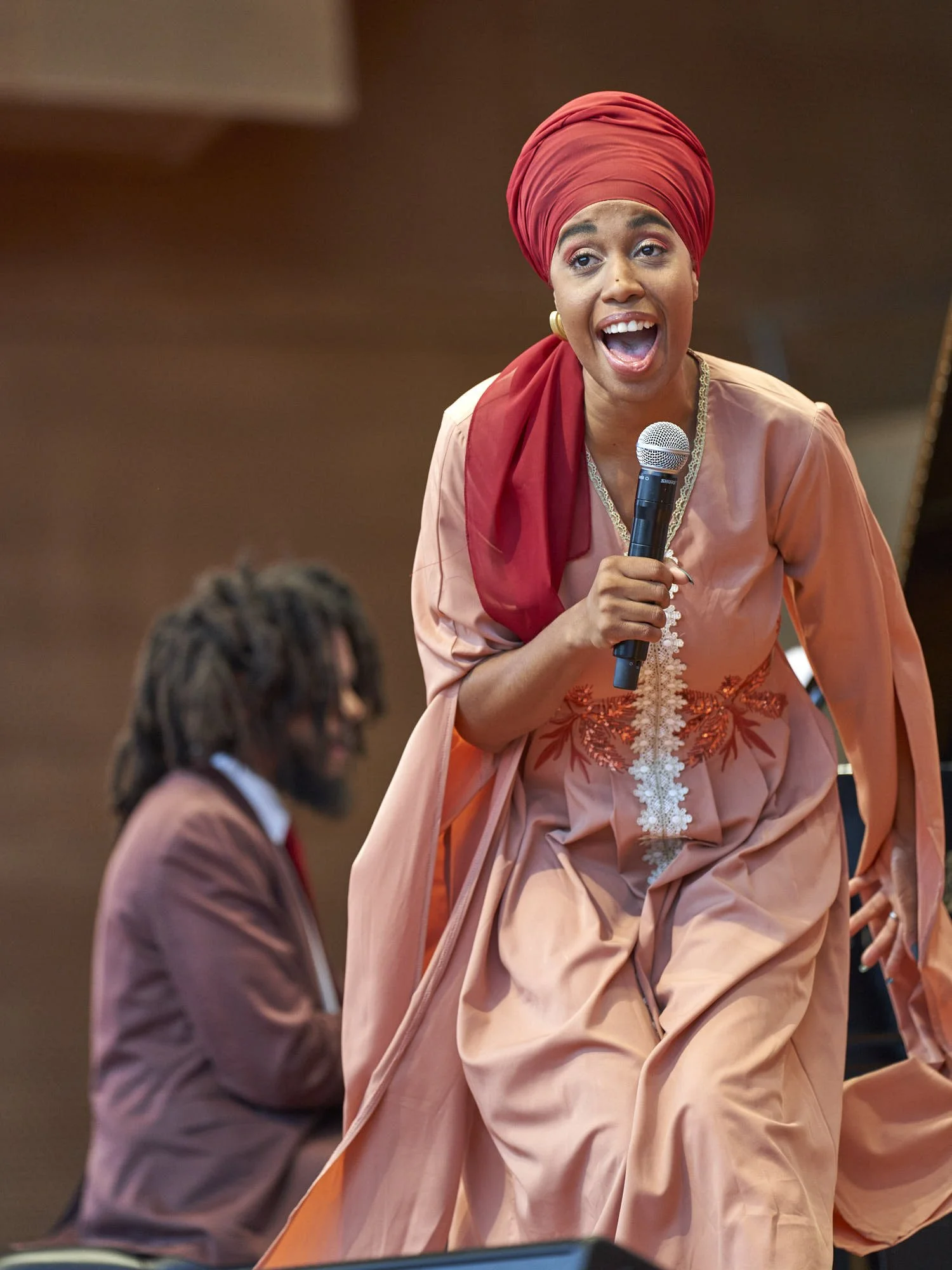 Next up, singer Jazzmeia Horn. As a photographer, I am greatly appreciate her creative attire. Always colorful and exotic, which I suspect is the point. I, however, am not a fan of her singing. Actually, she has a nice voice, but she relies too heavily on vocalizations—not scat singing; more an effort to imitate an instrument such as a horn. Also, her stories between numbers tend to ramble on. She would be well served to focus more on singing words and songs. The audience, however, seemed to enjoy her efforts, so I am in a minority.