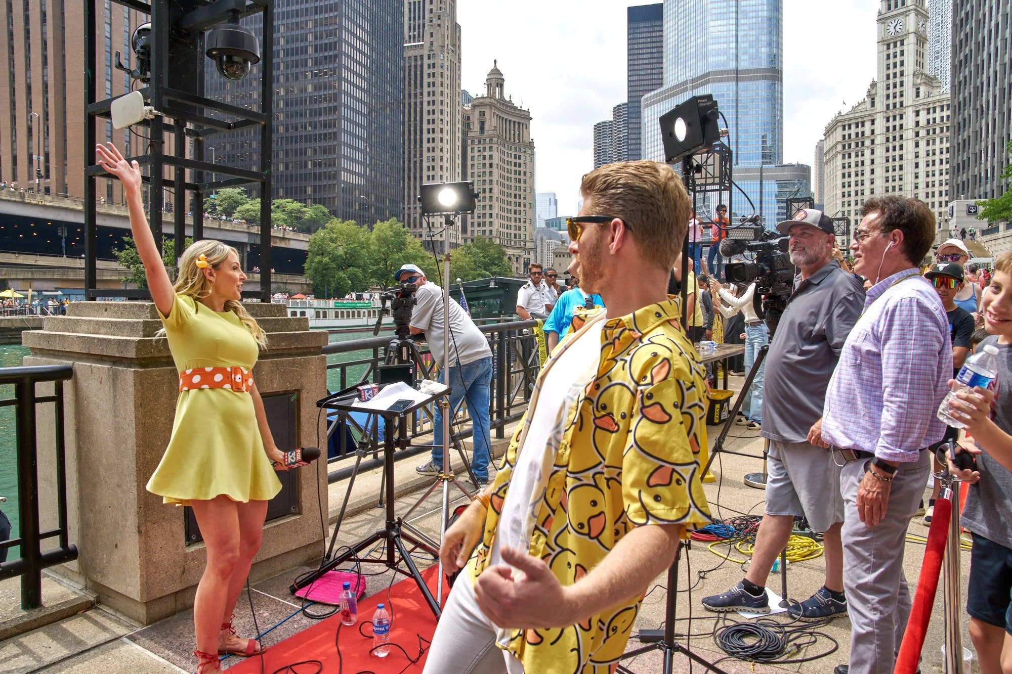 The festivities kicked off three hours earlier with a family-friendly party in the plaza separating the Tribune Tower from the Apple store on Michigan Avenue. Children were offered the opportunity to play a number of games, including taking part in a miniature duck race with windup ducks. Boy Band Night provided the music, enthusiastically offering up the pop hits of day, which included bits of K-Pop, several hip-hop favorites, and songs popularized by the Backstreet Boys, the Jonas Brothers and One Direction. For those interested in Instagrammable moments, there were several inflatable ducks scattered throughout the plaza.