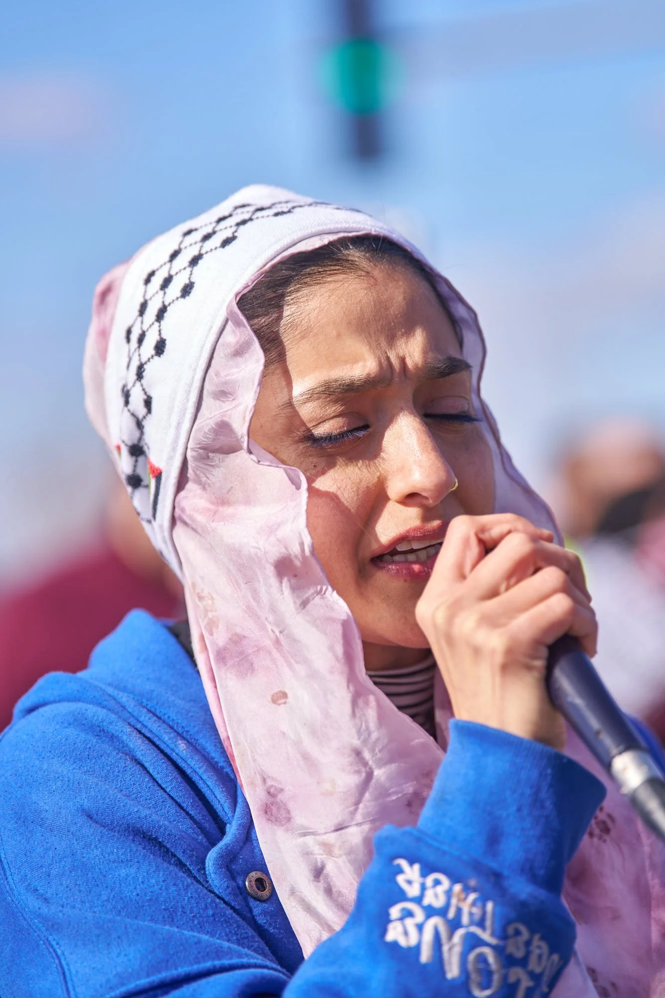 I had never been to Bridgeview, but I wanted to see the Palestinian community’s shops, mosques, and homes—the neighborhood. I will need to go back this summer to explore because today’s rally and march unfolded along a busy suburban thoroughfare lined with strip malls, vacant lots, and highway entrances and exits.
