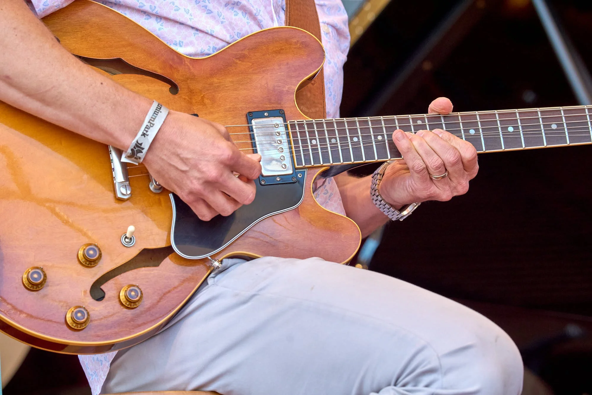 I did arrive in time in catch the 2:00 PM performance on the Von Freeman stage by guitarist Mike Ross. Smartly attired in all white, Ross was holding a beautiful hollow-body guitar. He opened his set with the Les McCann and Eddie Harris 1969 classic, Compared to What. Ross and company had all the inflections right, although the bass was a bit overbearing—most likely due to how the sound engineers handle the mix rather than choices made by bassist Ron Hall.