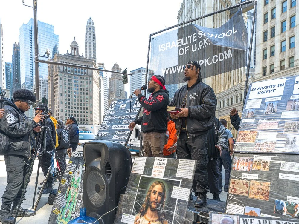 For the tourists, suburbanites, and other passersby, the Black Hebrew Israelites offer nothing a carnival-like spectacle. Gawk, snap a quick photo, but move on before the leader calls you out. A group of Jehovah Witnesses normally has an information “booth” feet from where the Black Hebrew Israelites were preaching, but the Witnesses were missing today.