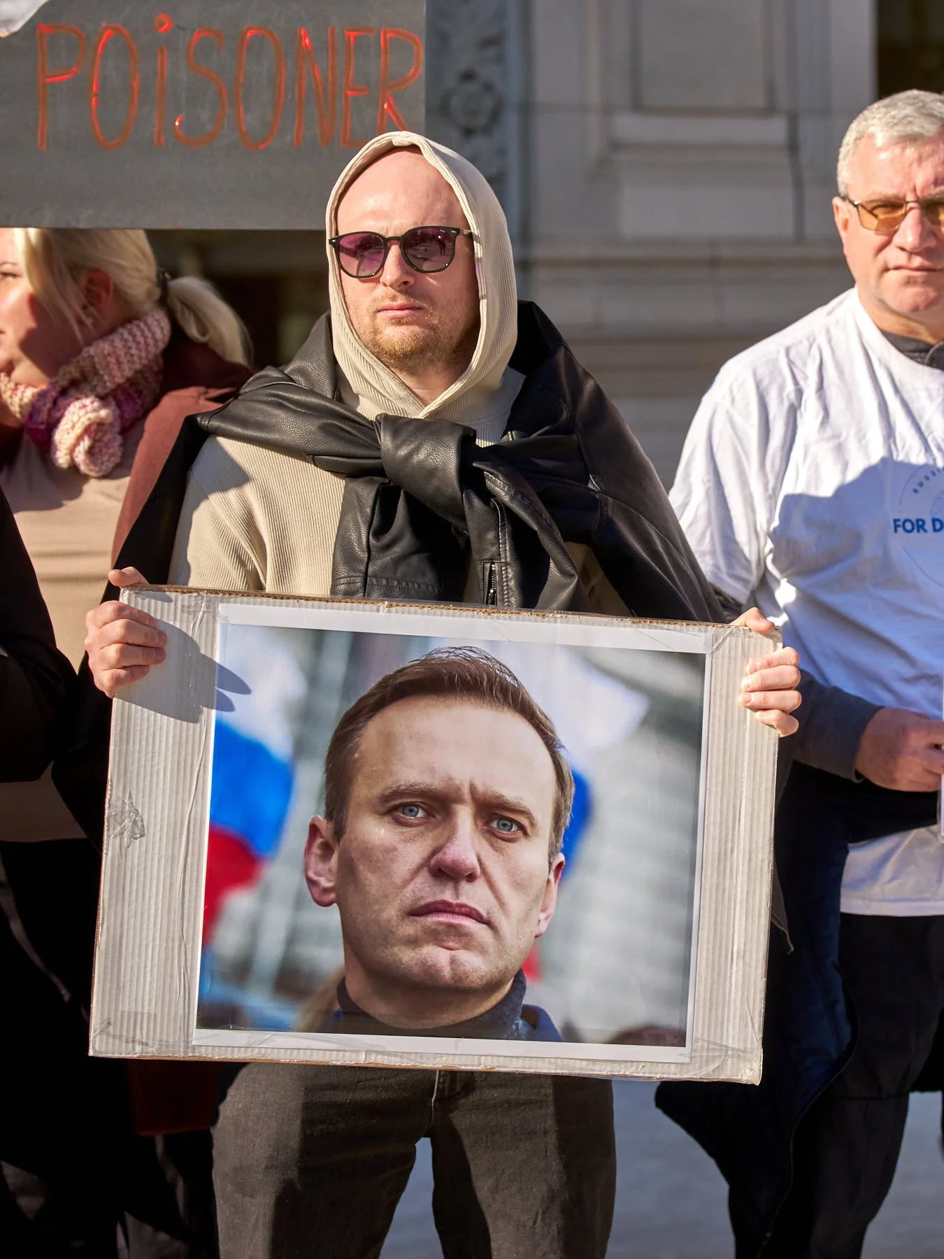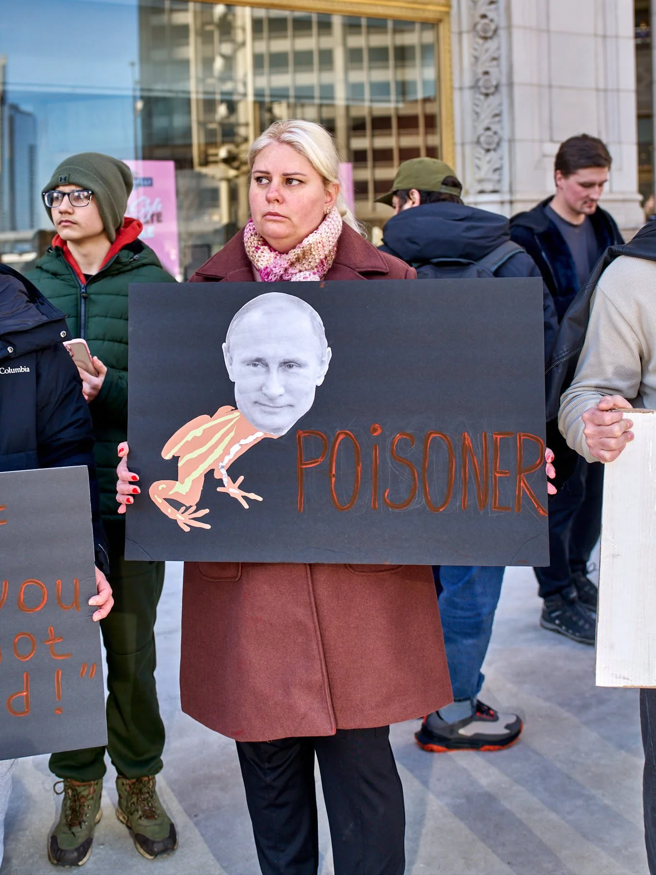 Two enterprising demonstrators held signs highlighting that epibatidine had been used to poison Navalny. One name-checked the toxin. The other’s black sign included a illustrated frog, with the word “Poisoner” scribbled next to the frog.