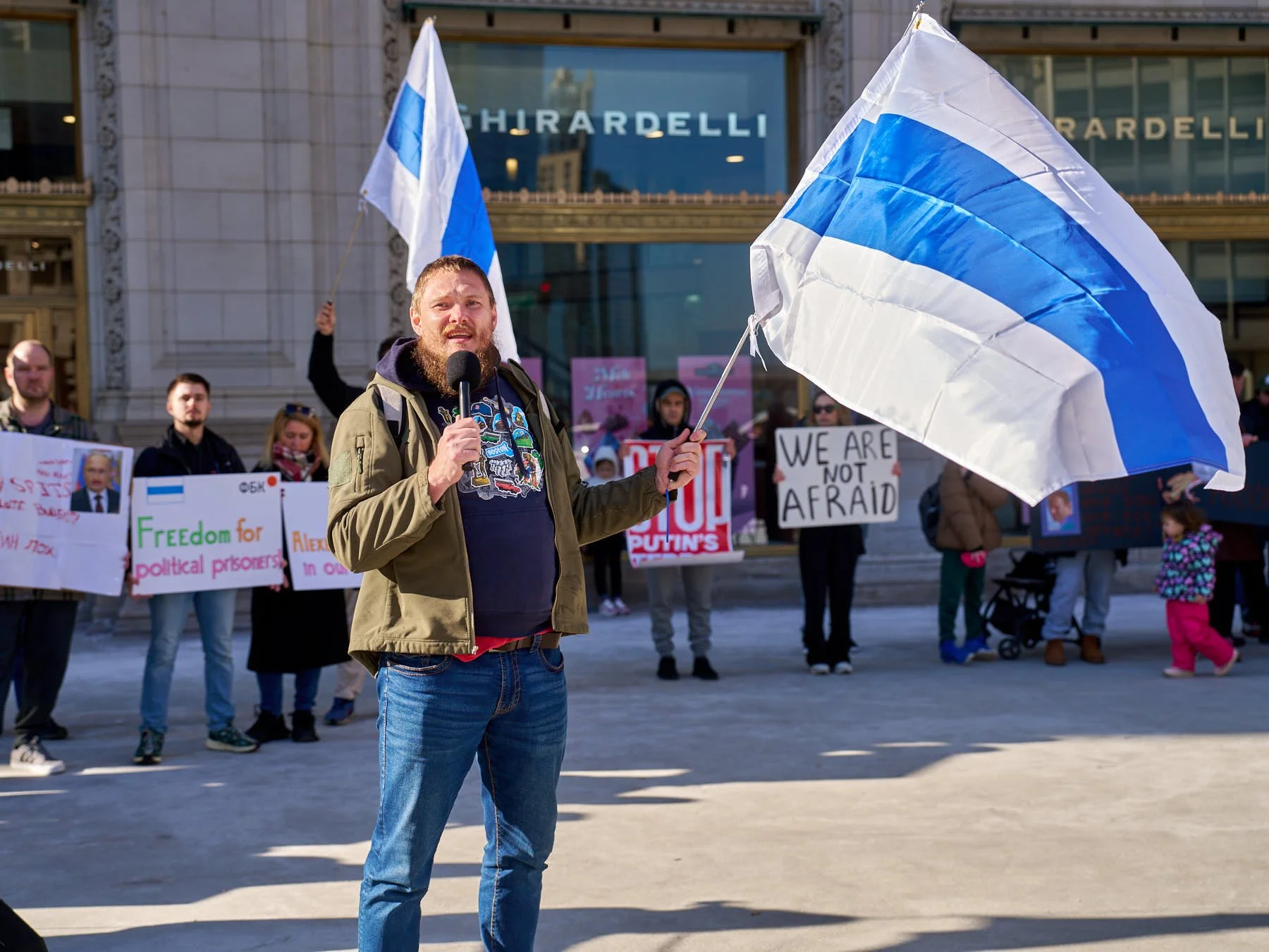 The demonstration lasted just under an hour, with many more people speaking than in the past. Those taking the mic kept their remarks brief, with many speaking in their native Russian. Lots of pedestrians enjoying the seasonally balmy temperatures paused to see what was happening. The 50 or 60 demonstrators caught the attention of the Sunday shoppers, while the attractive signage displayed on black stands set in front of the demonstrators explained why the Russians were demonstrating.