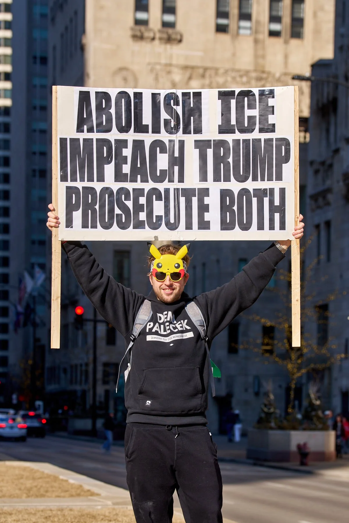 [Photographer’s Note: Before the demonstration began, one of my photographer buddies noted just how challenging the light was today. The white sunlight slashed its way across the plaza. My buddy noted that it would be virtually impossible not to blow out the whites. I noted the accentuated haze that hung over the river.]