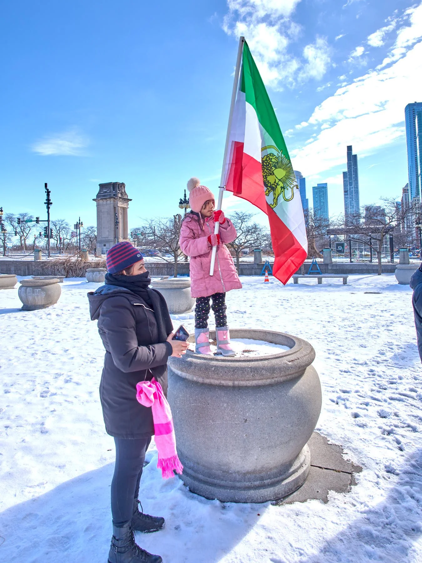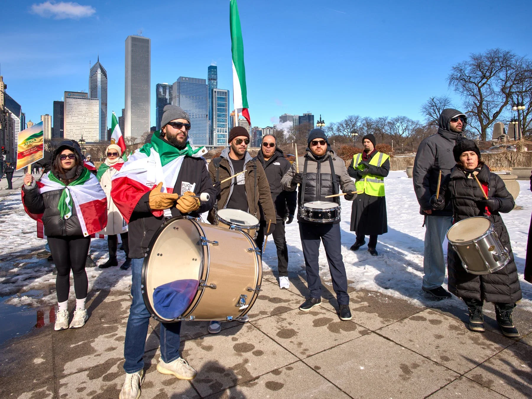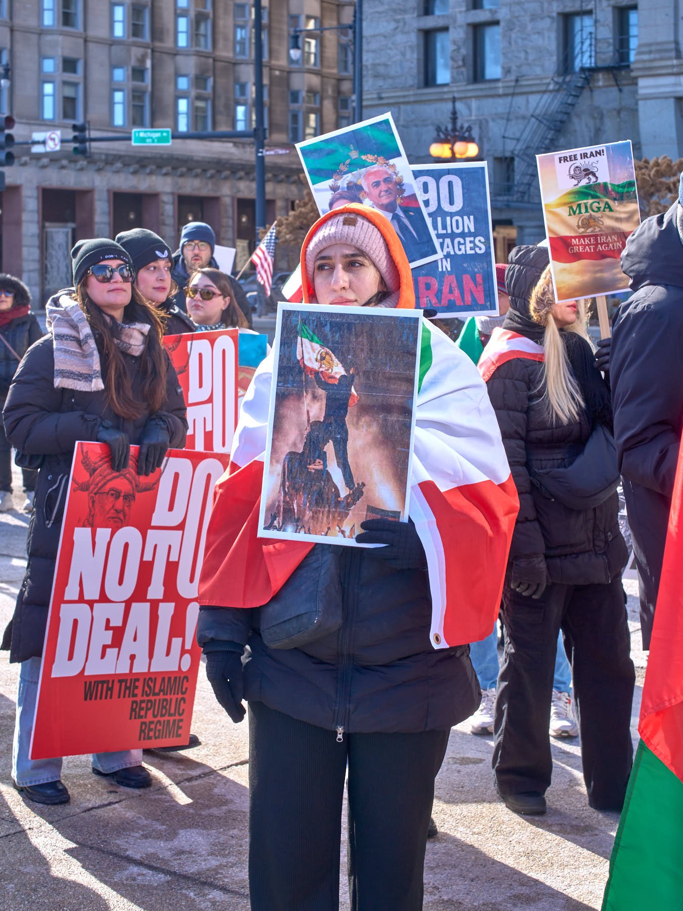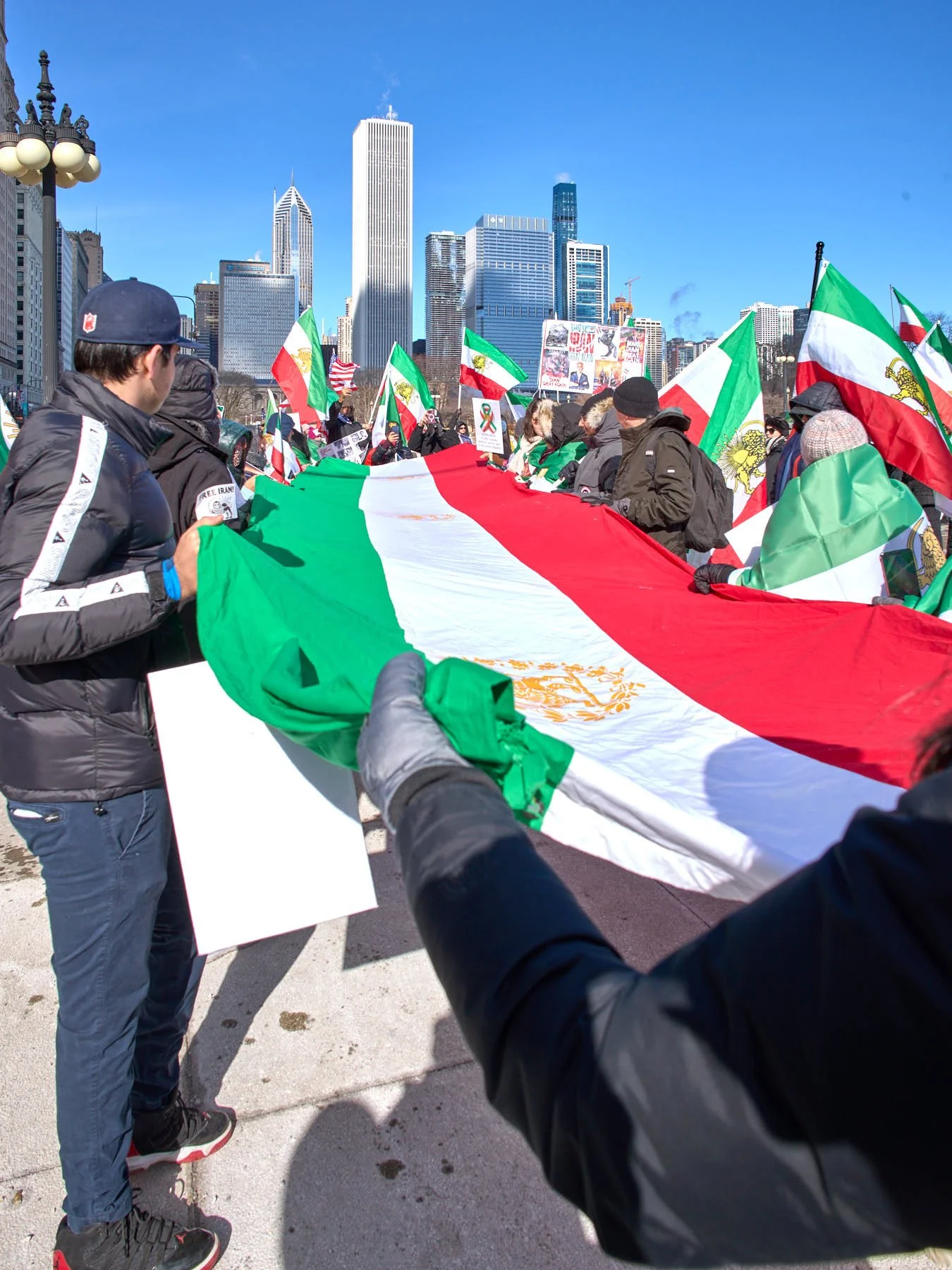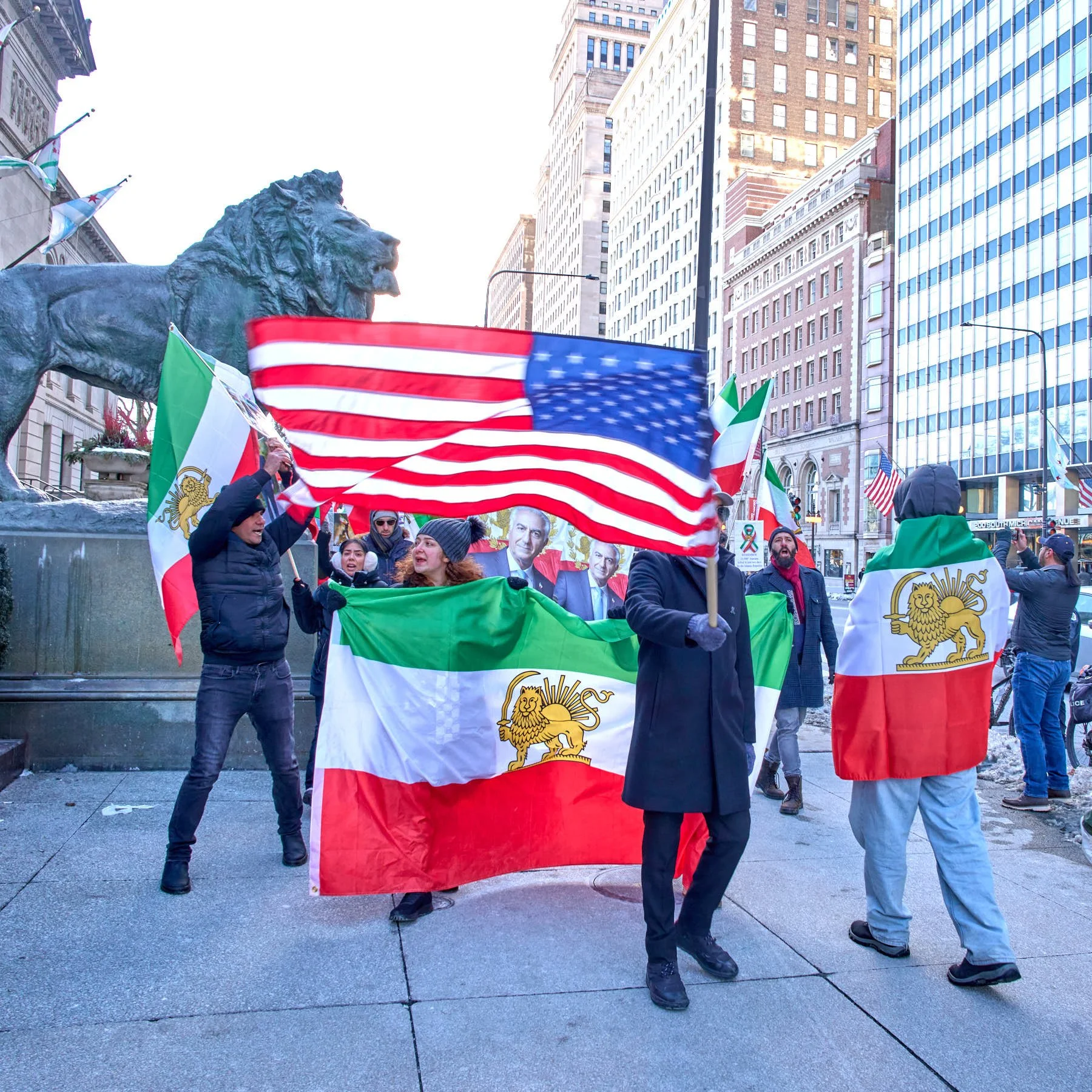 Following the speeches, the demonstrators, numbering somewhere between 150 and 200 people, lined up for the march to Daley Plaza. Hoping to catch the tail end of the anti-ICE demonstration, I headed to Daley Plaza as the Iranians were passing the Art Institute’s two lions. In part, I decided to leave because the Iranians were marching at a ridiculously slow pace. It was simply too cold to be dawdling.