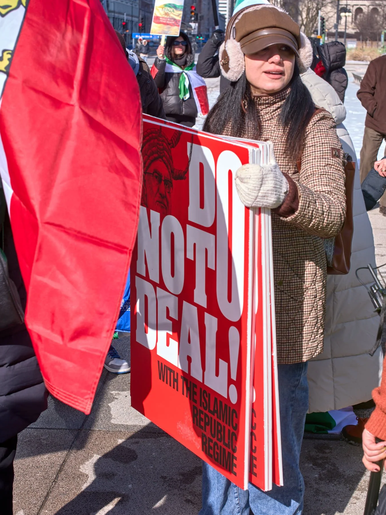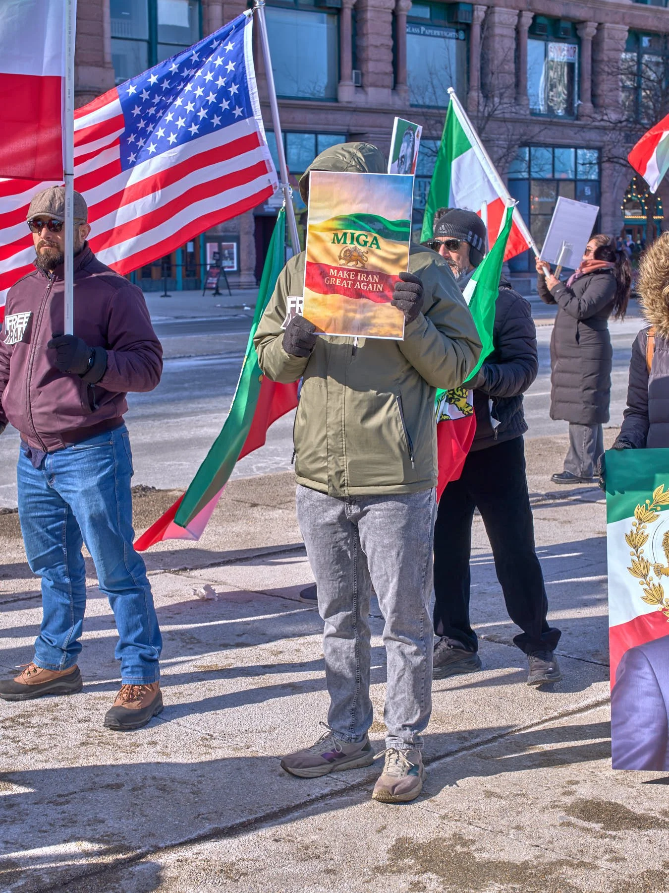 Thankfully, the rally in Congress Plaza was short, with only a few speeches. Most of the speeches and chants were in Persian, so I did not understand what was being said. Once again, I strongly recommend that heritage groups (e.g., Palestinians, Russians, and Ukrainians) refrain from falling back on their native languages. Lots of pedestrians are curious as they walk past the gathering, particularly when the flags and signs are colorful and dramatic. While the demonstrators may understand every word, the passersby have little reason to take in the event, which undermines the message that the demonstrators hope to convey to passersby. The fundamental question remains: Are you trying to convince the public to support your cause, or are you just talking to yourselves?