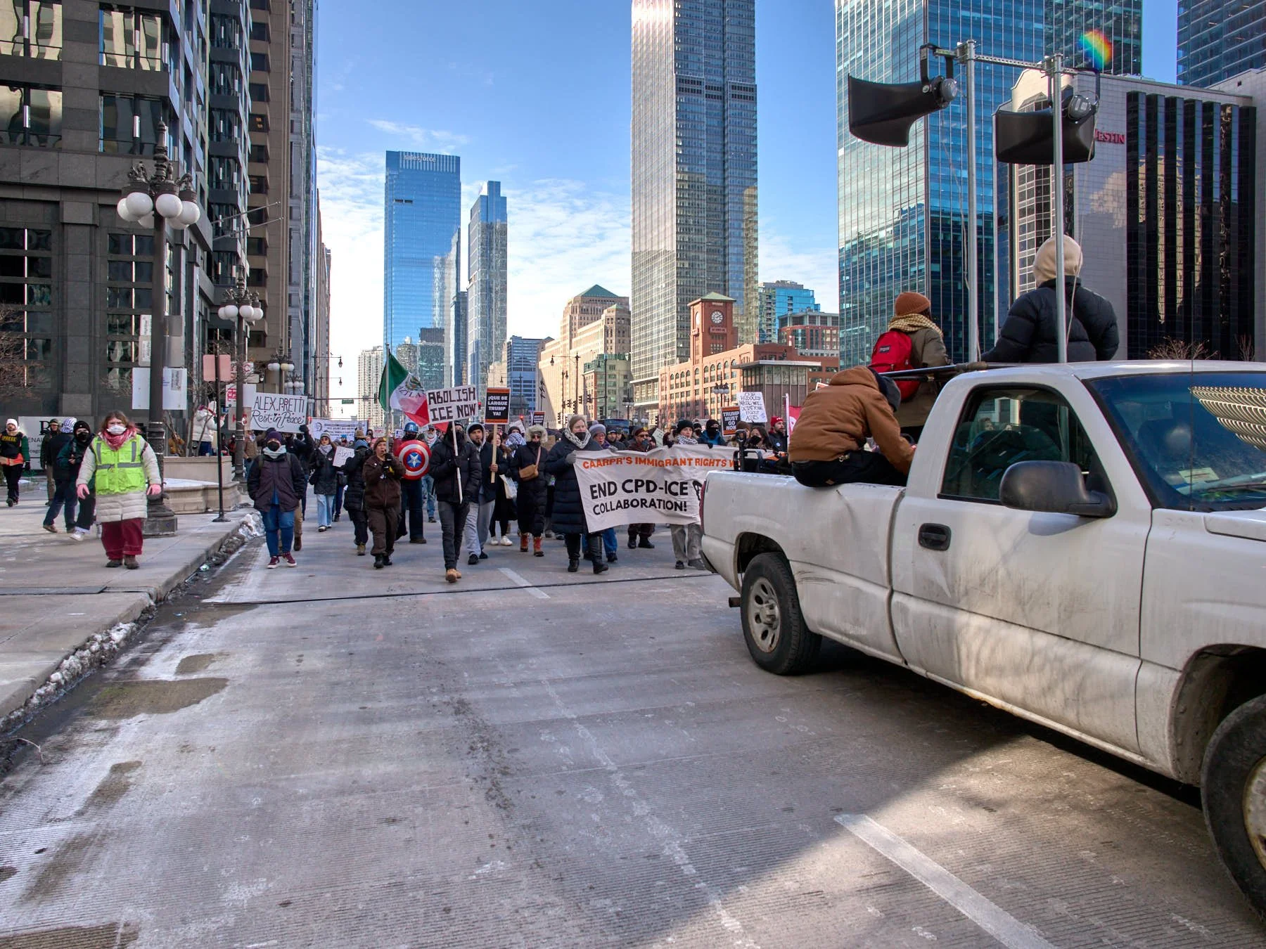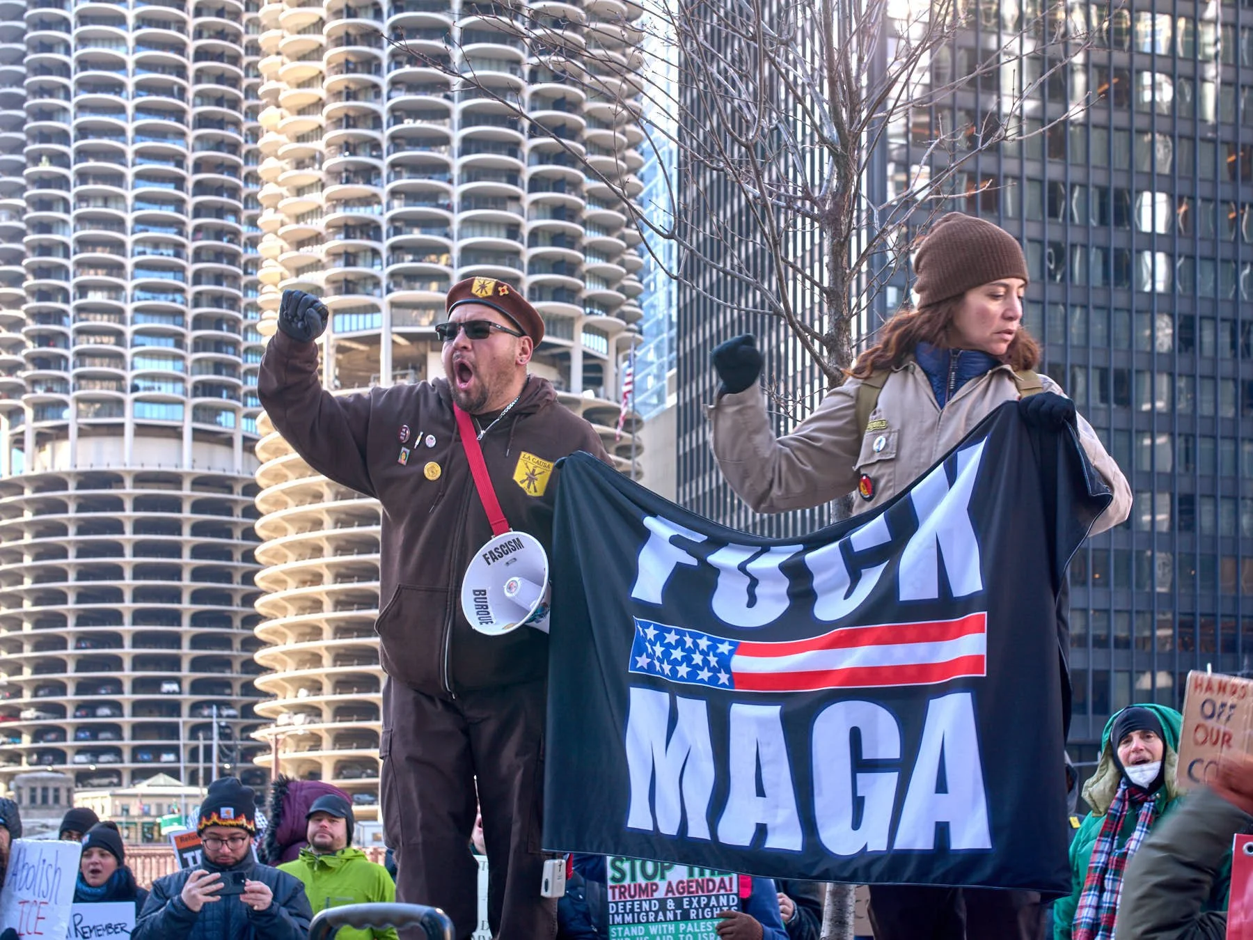 As Daley Plaza came within my sight, I saw the anti-ICE demonstrators already marching north on Dearborn, heading toward Wacker Drive, across the river from Darth Vader’s (Trump’s) tower. It would have been interesting had the Iranians and the anti-ICE demonstrators run into each other, either in Daley Plaza or across the river from Trump Tower. After all, the anti-ICE demonstrators detest Donald J. Trump, while the Iranians support him because he is willing to use the U.S. military to bring down the repressive Iranian theocracy.