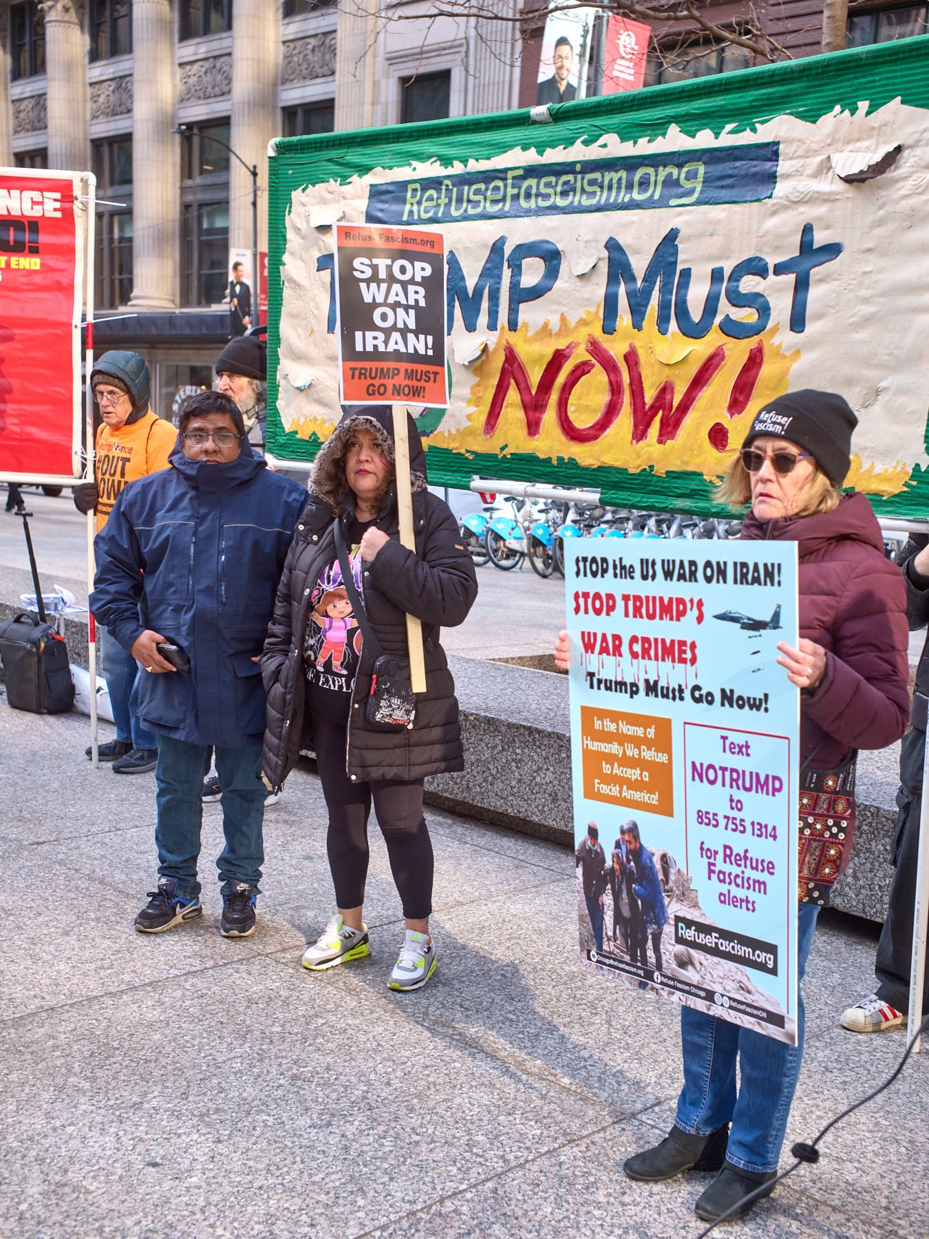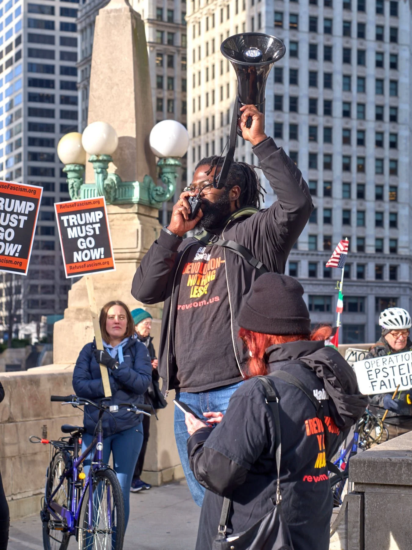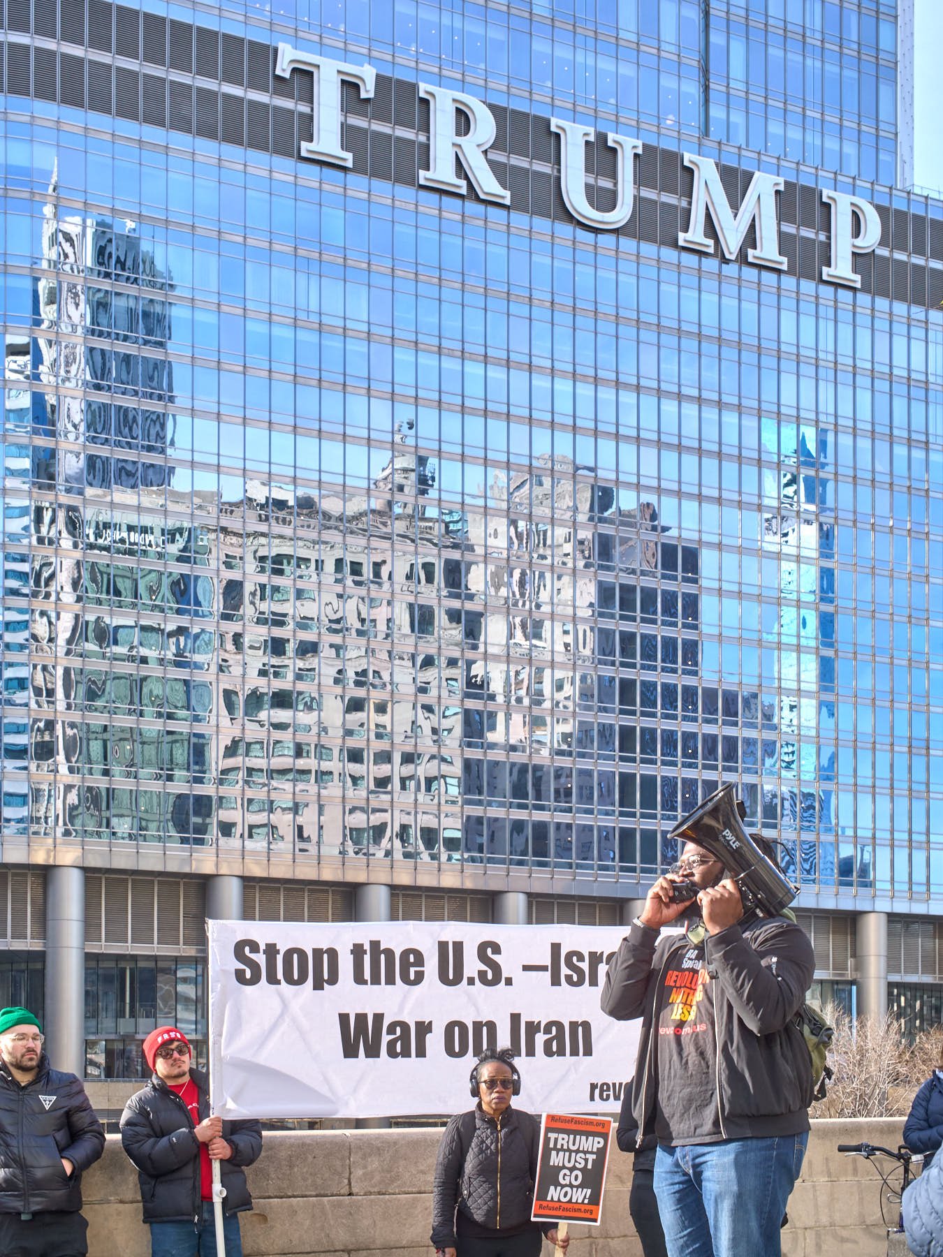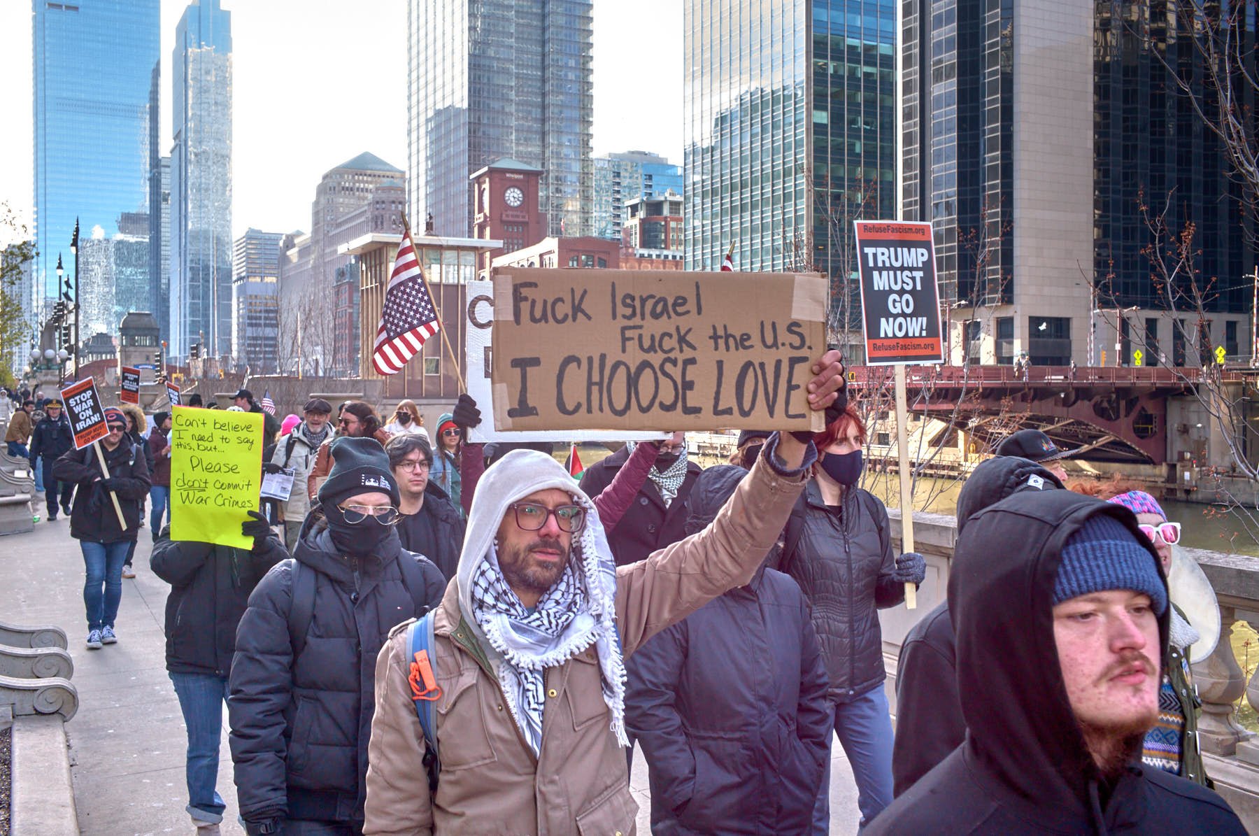 The man who had the microphone announced that some Iranians were demonstrating in the plaza outside the Wrigley Building. He then proposed that the group join those demonstrators. After snapping the obligatory image of the demonstrators with the word “Trump” emblazoned on Trump Tower behind them, I made a beeline across the Michigan Avenue Bridge, so that I would be in position when the anti-Trump demonstrators arrived minutes later.