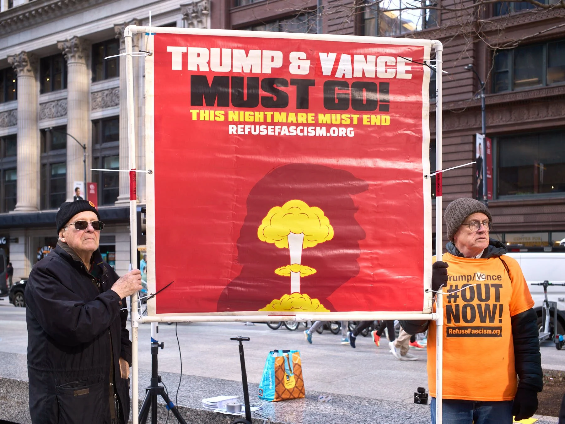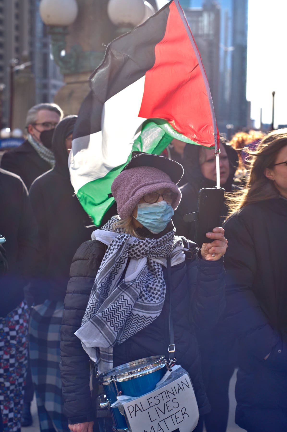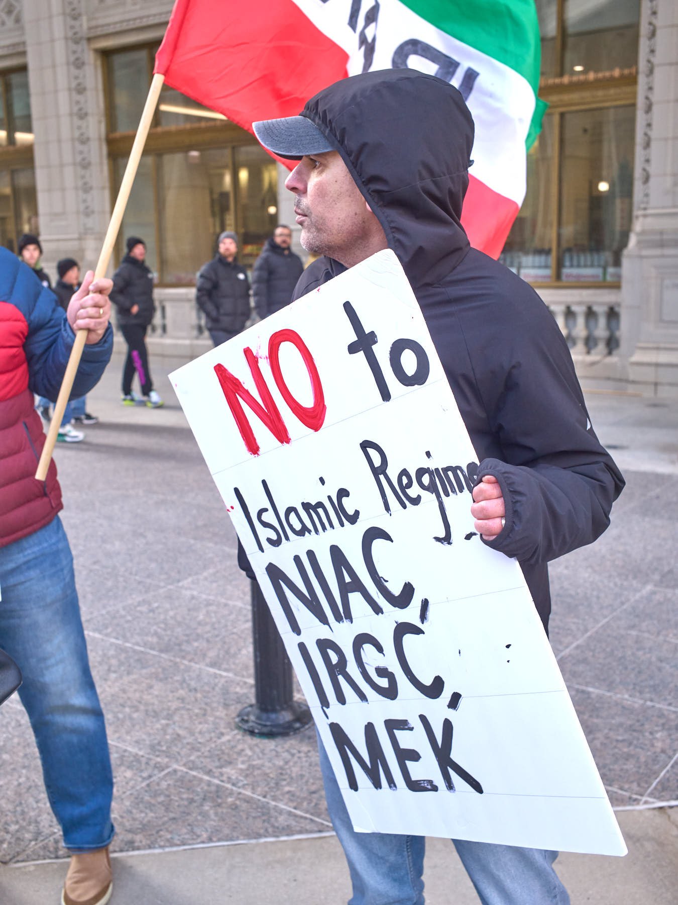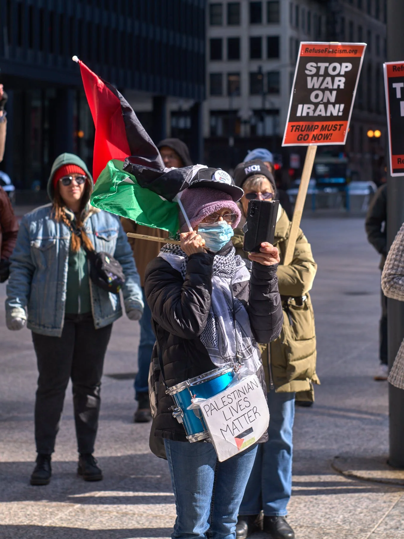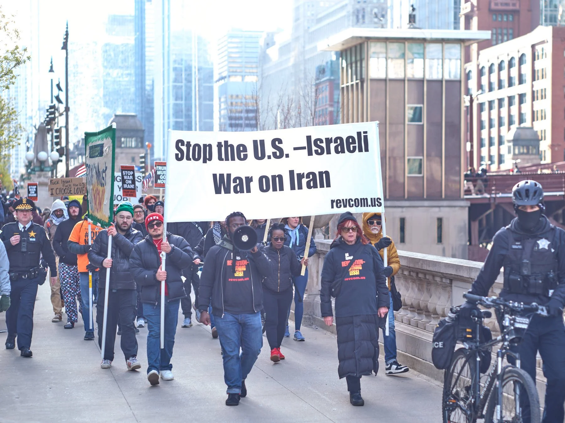 The man who had the microphone announced that some Iranians were demonstrating in the plaza outside the Wrigley Building. He then proposed that the group join those demonstrators. After snapping the obligatory image of the demonstrators with the word “Trump” emblazoned on Trump Tower behind them, I made a beeline across the Michigan Avenue Bridge, so that I would be in position when the anti-Trump demonstrators arrived minutes later.