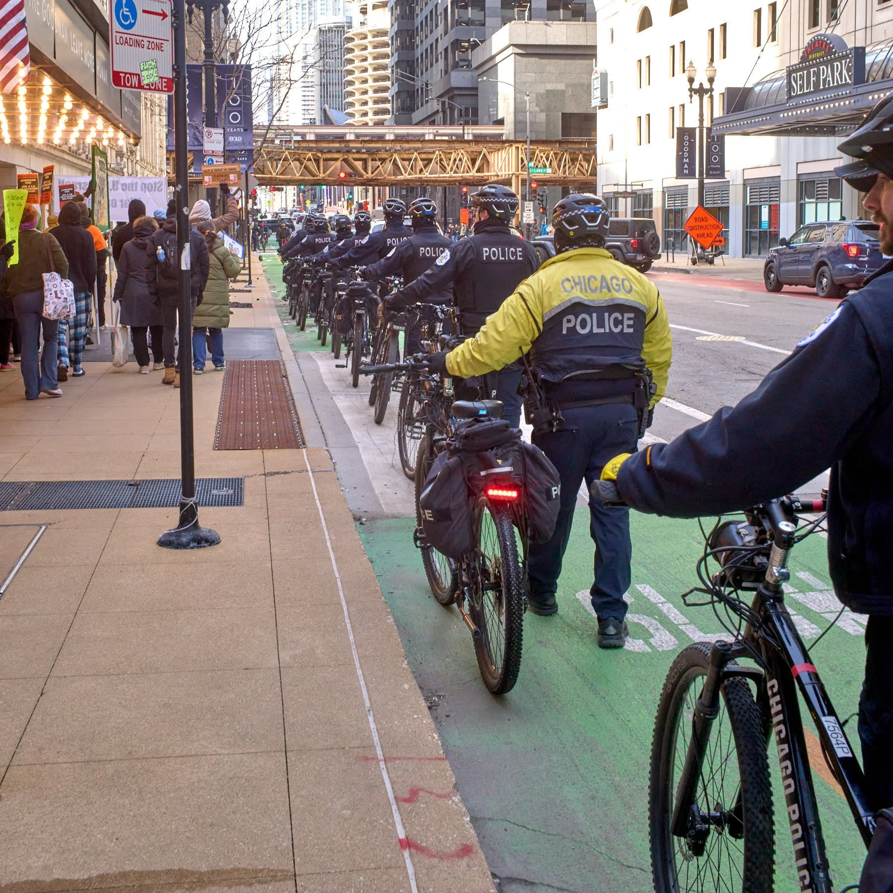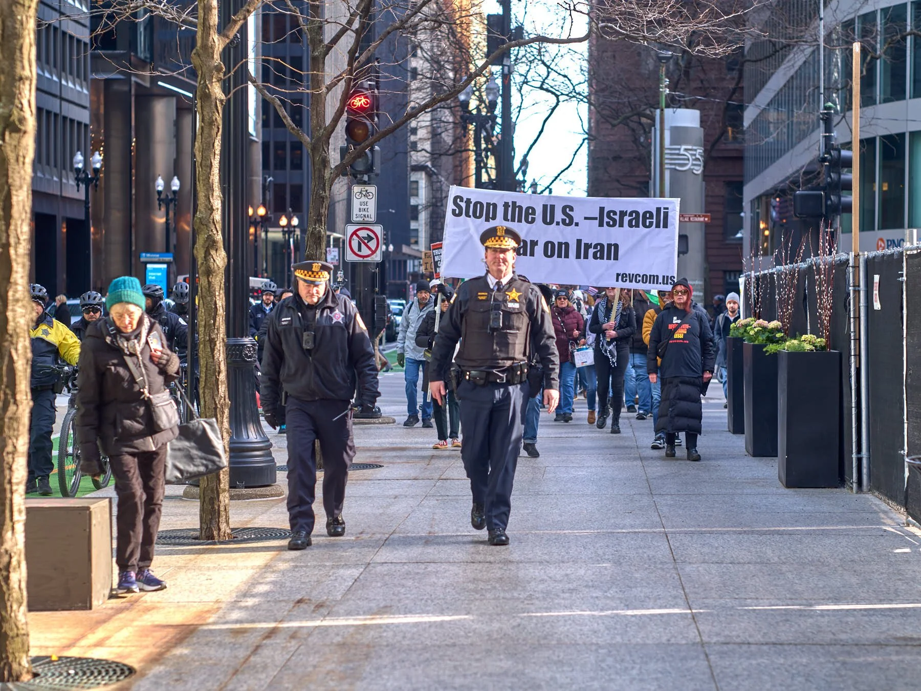Under CPD escort, the demonstrators then marched north on Dearborn until they reached Wacker Drive. At that point, Trump’s magnetic aura pulled the marchers toward his signature tower. I was walking with a member of CPD at that point. I said to him, “The worst thing Trump ever did was put his name on that building.” I got a laugh, but my observation is spot on. Virtually every demonstration in the city either ends at or proceeds along Wacker, so the demonstrators can stop, face the building, and recite catcall chants.