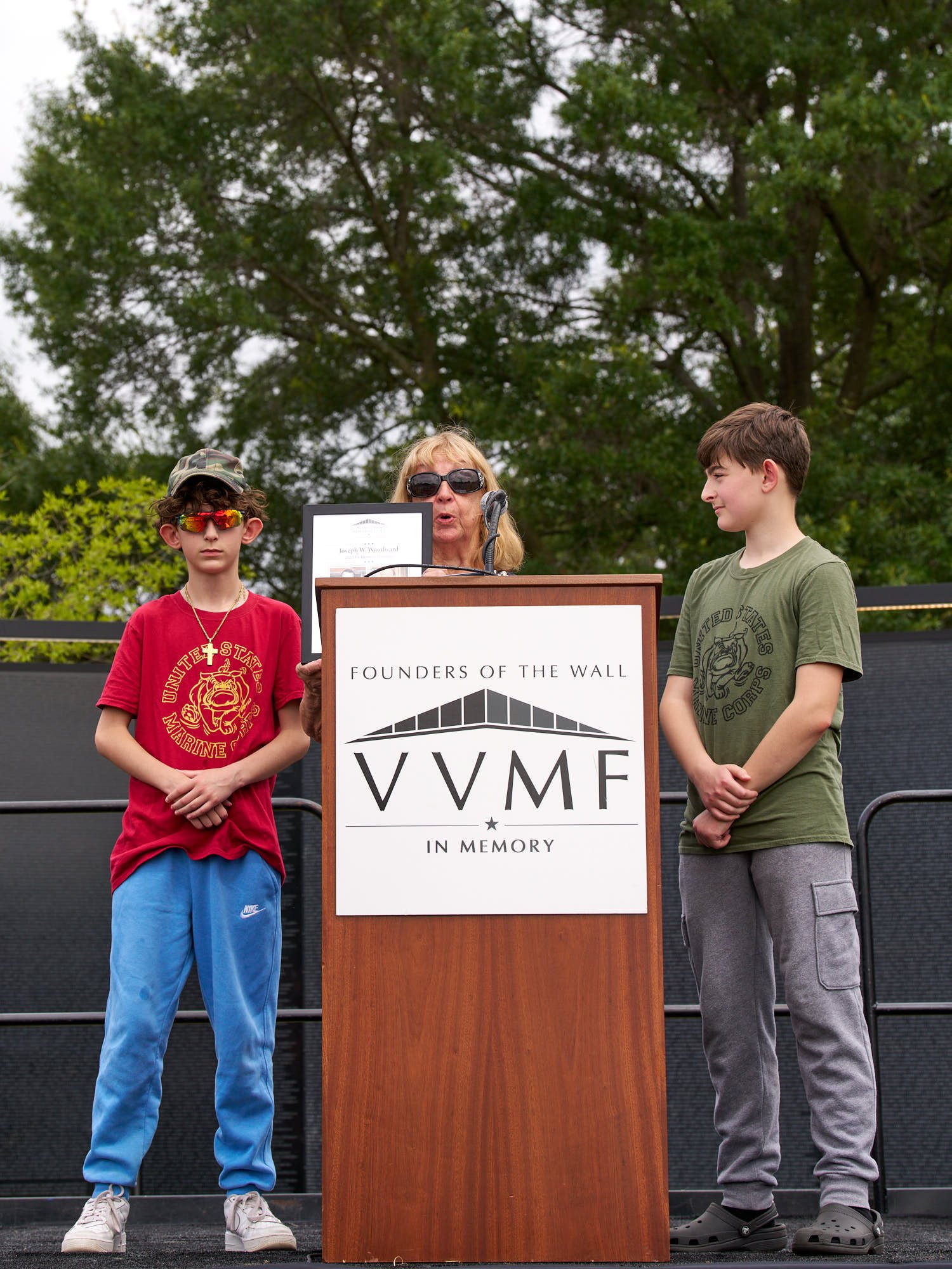 Each year on Flag Day, VVMF holds a ceremony at the Wall where family members or friends walk to the podium, and then read the name of their loved one, together with his rank and service branch affiliation.